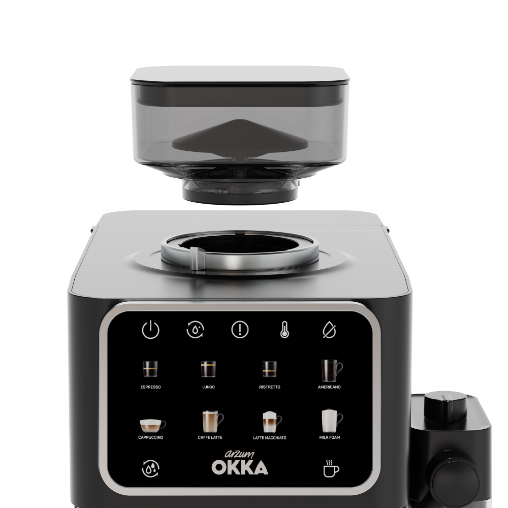 تم تصميم هذه الماكينة بهيكل أسود أنيق ولمسة نهائية لامعة من الكروم، لتضفي لمسة من الأناقة على أي مطبخ أو ركن قهوة مع تجسيد تصميم OKKA المميز.