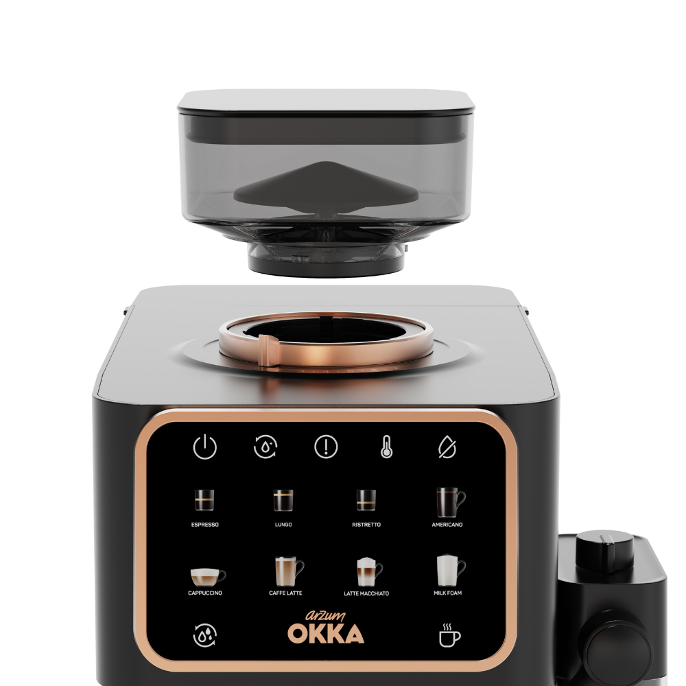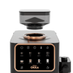 صُممت هذه الماكينة بهيكل أنيق باللون الأسود مع لمسات نهائية نحاسية لامعة، لتضيف لمسة من الفخامة والرقي إلى أي مطبخ أو ركن قهوة، مع تجسيد أسلوب أوكا المميز في التصميم.